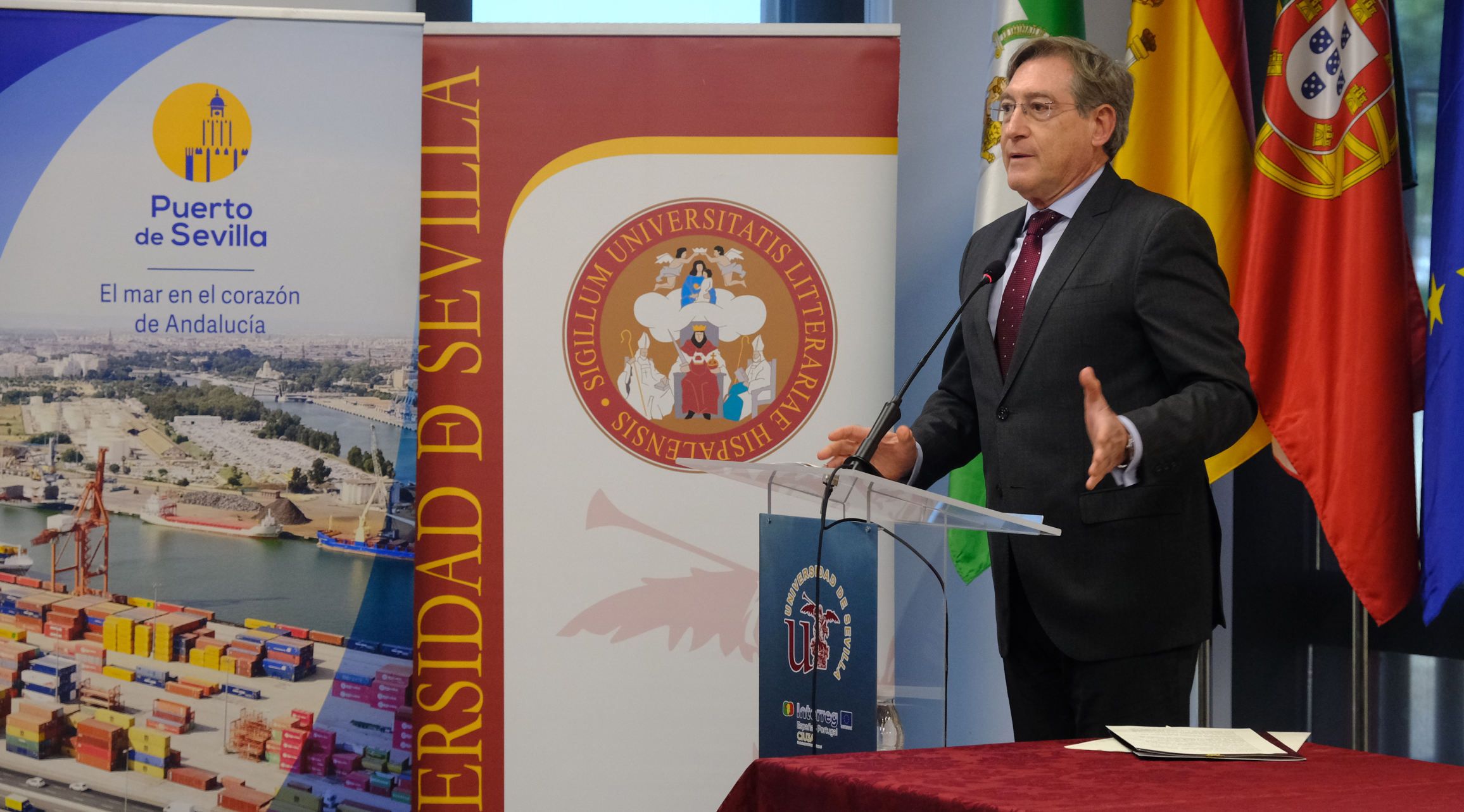 Durante su intervención, el presidente de la Autoridad Portuaria de Sevilla ha destacado "el trabajo conjunto entre doctores, doctorandos y empresas que, apoyados en las instituciones, favorecen la competitividad portuaria y una mayor productividad que nos permitirá ser líderes en los diferentes sectores en los que operamos".